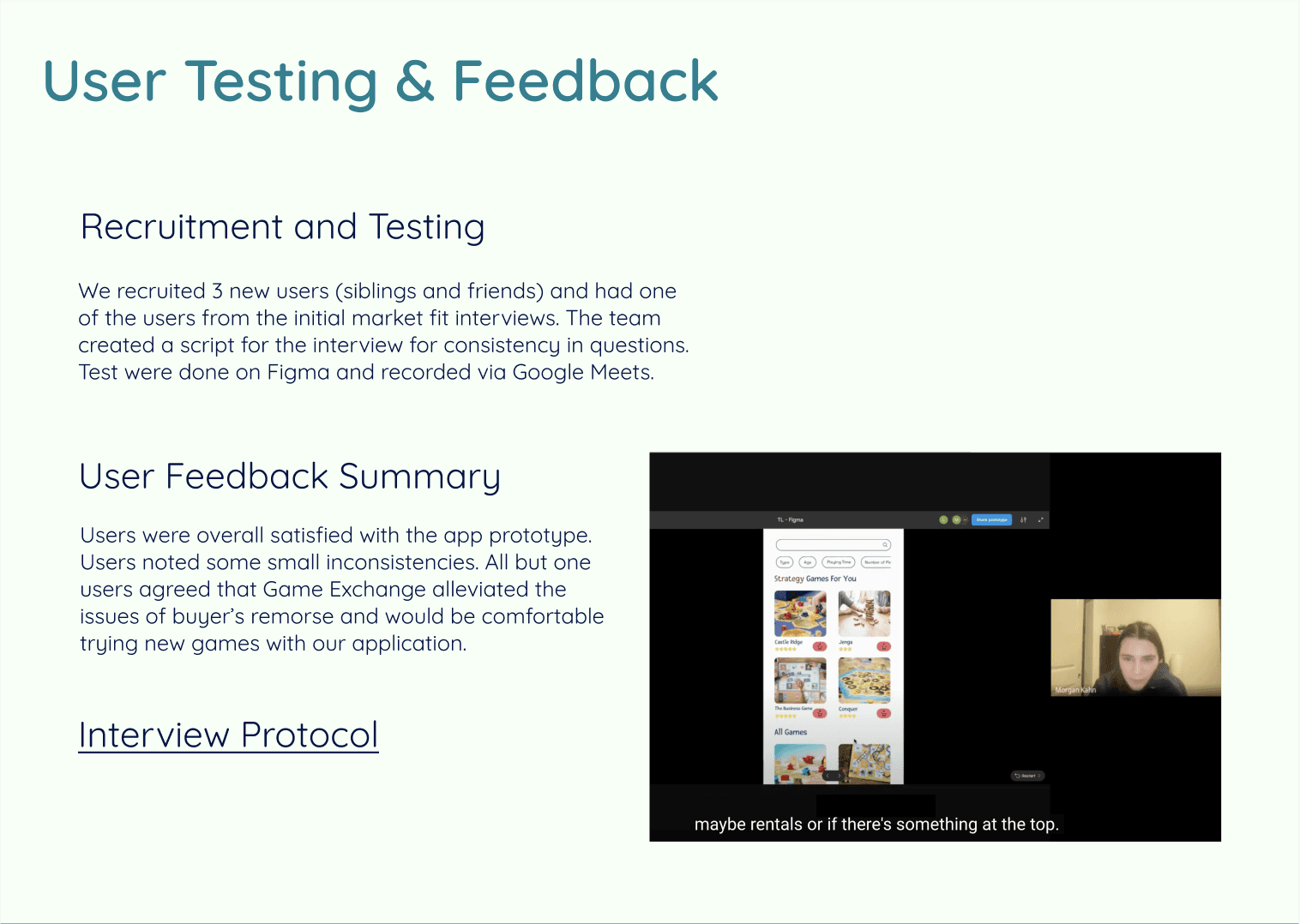 Board games continue to be a popular choice for social interaction, especially among young people looking for fun, engaging ways to connect with friends. However, buying board games can be costly and overwhelming due to the sheer number of choices and uncertainty around which games will be enjoyable or worth the investment. Our team set out to better understand the habits, motivations, and frustrations of board game buyers and players between the ages of 16 and 30. These insights led us to develop Game Exchange: a board game rental e-commerce app similar to Turo and Airbnb that helps users rent games affordably, discover new favorites, and connect through shared experiences without the commitment of buying.